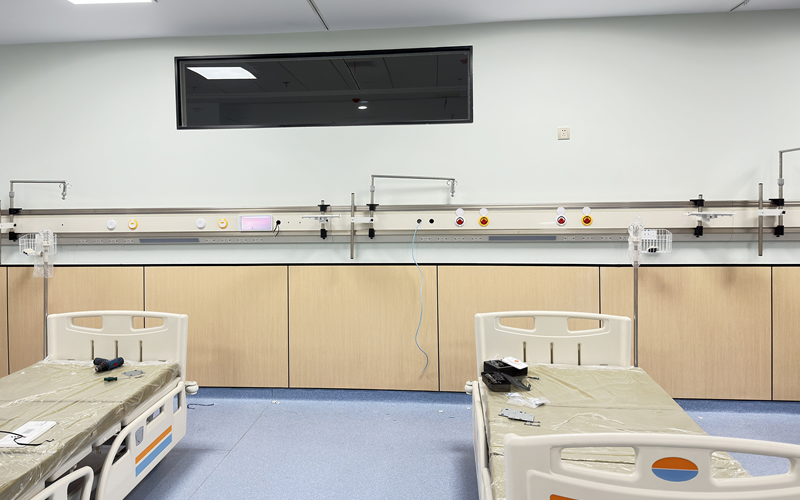CCU病房采用多功能導(dǎo)軌式設(shè)備帶,床頭配置可移動(dòng)式導(dǎo)軌托架、掛鉤、器械框以及醫(yī)用氣體和醫(yī)護(hù)對(duì)講設(shè)備。
