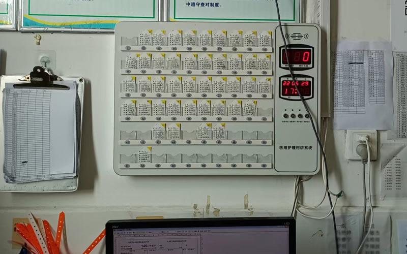 每個(gè)樓層病區(qū)的護(hù)士站安裝一臺(tái)呼叫對(duì)講系統(tǒng)主機(jī),走廊安裝雙面顯示屏。此款醫(yī)院病房呼叫對(duì)講系統(tǒng)為兩芯總線制,護(hù)士站主機(jī)集系統(tǒng)控制主機(jī)、對(duì)講電話機(jī)、病員一覽卡槽設(shè)計(jì),被廣泛應(yīng)用于鄉(xiāng)鎮(zhèn)衛(wèi)生院護(hù)士站病床呼叫對(duì)講使用。