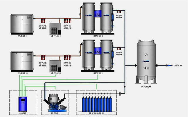 醫(yī)院中心壓縮空氣系統(tǒng)機(jī)組一般采用螺旋桿空壓機(jī)、冷干機(jī)、過濾器、儲(chǔ)氣罐等設(shè)備組成,通過管道連接至手術(shù)室、ICU、搶救室以及普通病房。