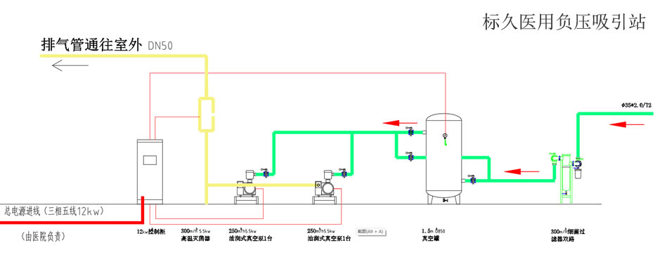 4、中心吸引站應(yīng)設(shè)置應(yīng)急備用電源并連接到站房配電箱,由院方負責(zé)。