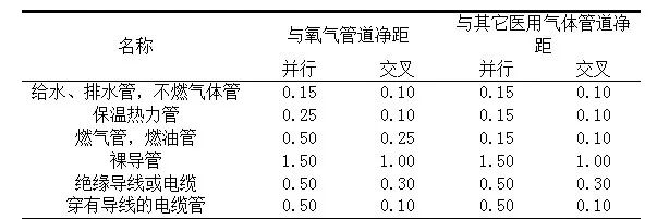醫(yī)用氣體管道與其他管道之間的最小間距應(yīng)符合下表2規(guī)定。無法滿足時(shí)應(yīng)采取適當(dāng)隔離措施。