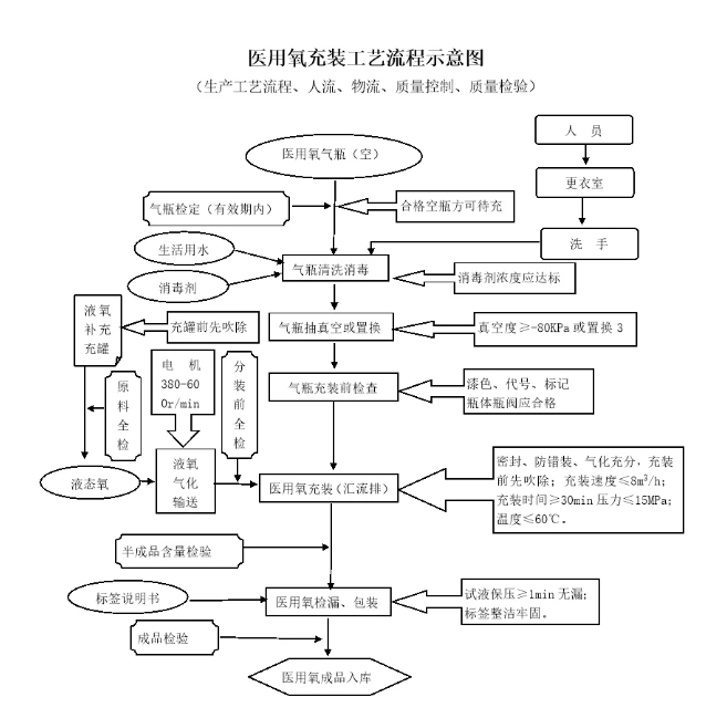 3.檢驗合格的氣瓶按《氣瓶干燥抽真空標準操作規(guī)程》進行空瓶抽真空或置換,操作完畢進行醫(yī)用氧的充裝,充氣前仔細檢查連接裝置是否牢靠,充氣時隨時觀察壓力表的變化及瓶內是否有異響,當壓力升高到9.81MPa和12.26MPa時,檢查瓶身溫度不應超壓充裝;充氣速度應保持在8立方米每小時,且充裝時間不應小于30分鐘。