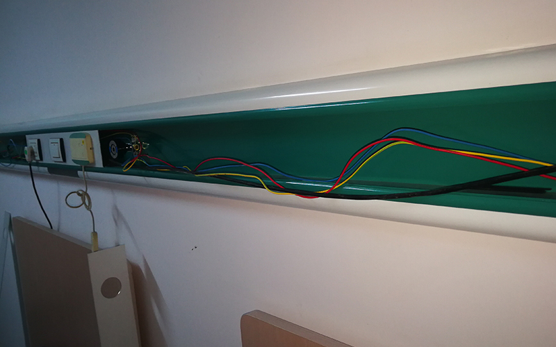 3、為了安裝簡單美觀,一般每個房間的引入管都是從天花板內(nèi)的水平管道引出的,從引出端到進入設(shè)備帶的部分管道外用鋁合金蓋覆蓋;鋁合金設(shè)備帶安裝了氧氣、氣體截止閥、吸引力、壓縮空氣管道和快速插座,快速插座一般離地1.4m;