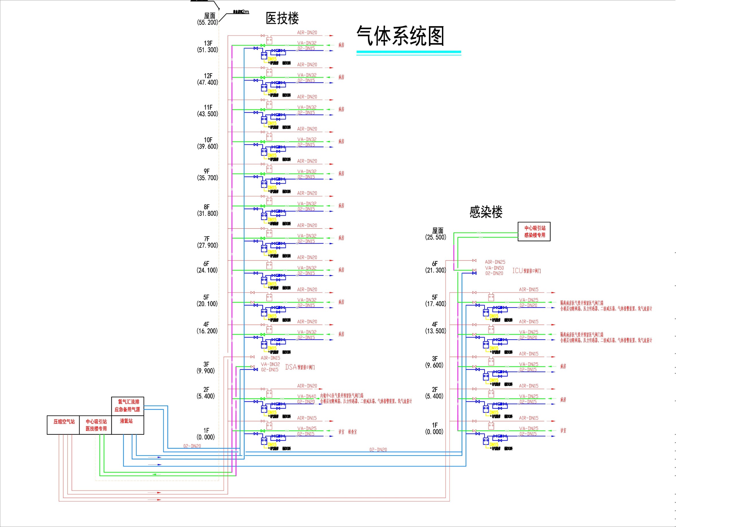 中心供氧系統(tǒng)由氧氣站、供氧管道、穩(wěn)壓箱、閥門、氧氣終端、報警裝置、濕化瓶或呼吸機(jī)組成;壓縮空氣系統(tǒng)主要由空氣壓縮機(jī)、儲氣罐、干燥機(jī)、過濾器、輸氣管道、閥門組成;負(fù)壓吸引系統(tǒng)的配置原理與供氣系統(tǒng)相同,由吸引站、輸氣管道、檢測報警裝置和吸引設(shè)備組成。